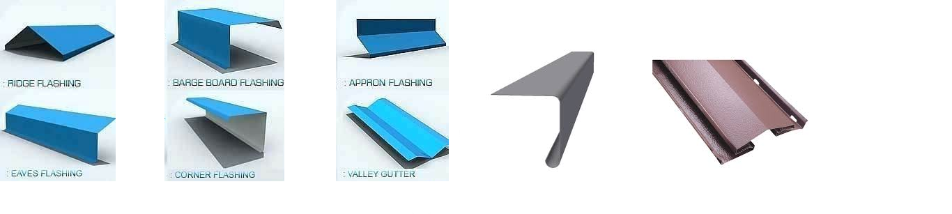 Corner flashing, drip trims, ridge vent, ridge cover, down take spout, curved canopy’s, gutter, facia front & side, clamps & brackets.